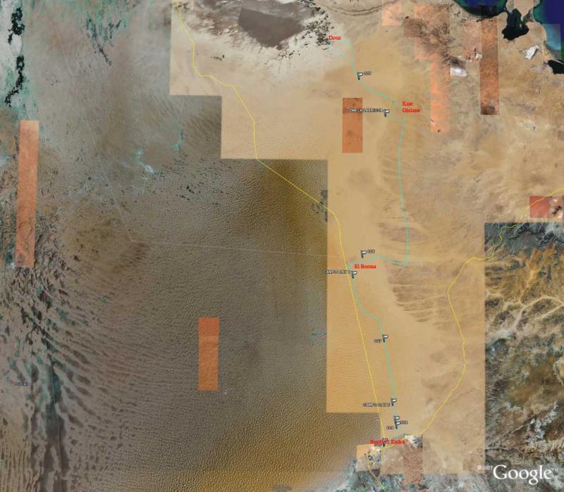 Il giro: in giallo i confini tunisini, in azzurro il percorso, le bandierine sono i campi, in tutto 8 giorni |