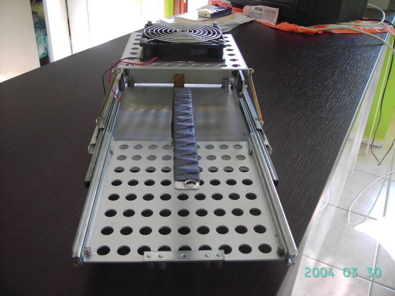 il telaio completamente assemblato con il carrello radio in posizione estratta visto di fronte. In pratica il carrello che vedete fuoriesce da sotto il sedile passeggero anteriore verso dietro.